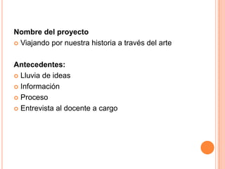 Este proyecto educacional propone vincular cinco subsectores - artes visuales, lenguaje y comunicación, educación musical, ciencias sociales y educación tecnológica - para que estudiantes de tercer año básico exploren la historia a través del arte. El proyecto utilizará recursos como la música, la expresión corporal y verbal, así como tecnologías y manifestaciones artísticas de los pueblos originarios, con el fin de desarrollar capacidades artísticas y de apreciación cultural en los estudiantes.