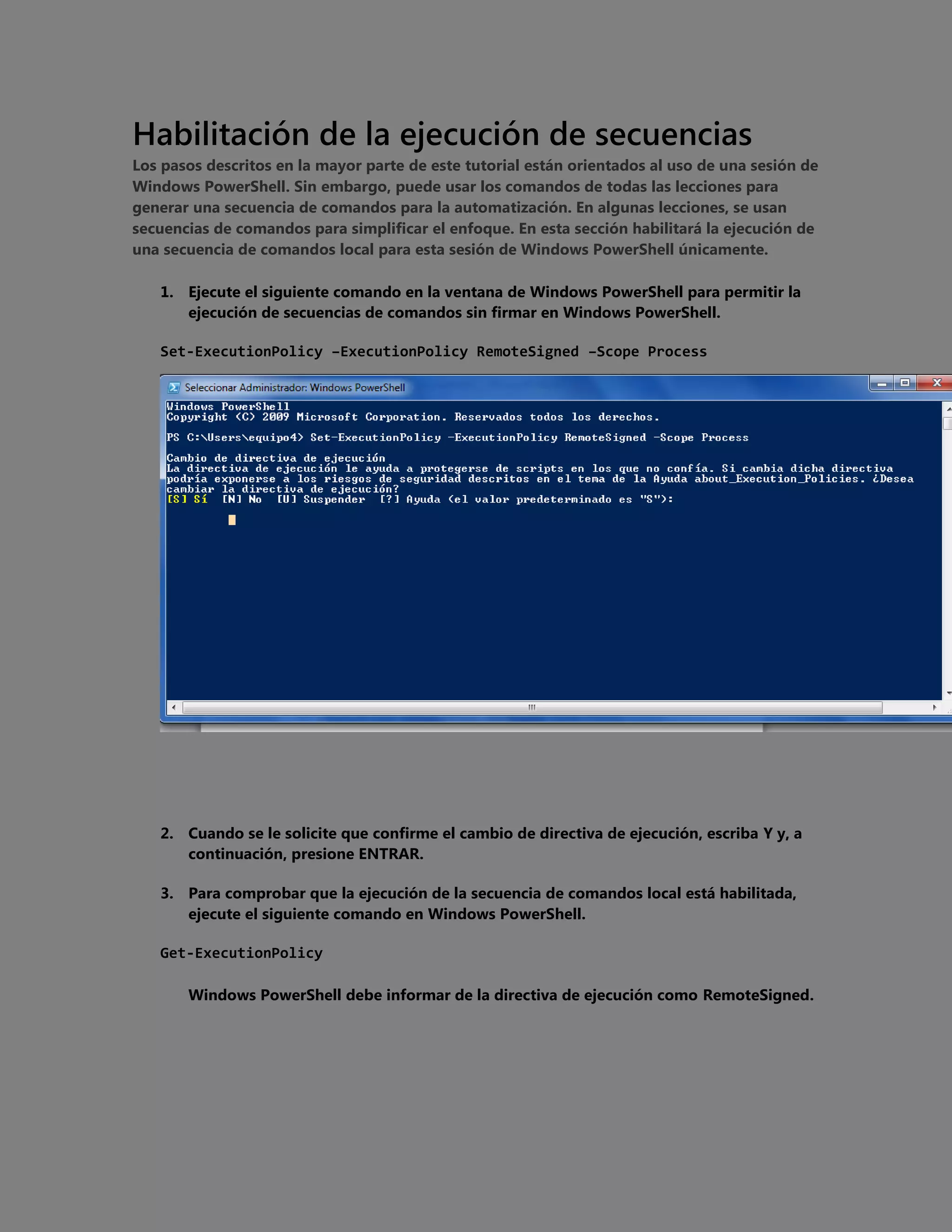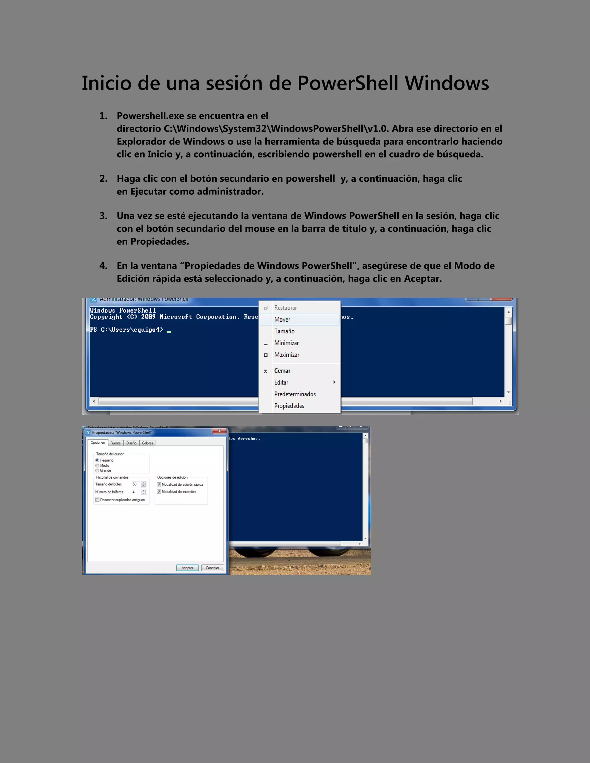 Este documento describe los pasos para iniciar una sesión de PowerShell, habilitar la ejecución de scripts y cargar módulos. Explica cómo abrir PowerShell como administrador, configurar las propiedades y establecer la directiva de ejecución en "RemoteSigned" para permitir scripts locales sin firmar en la sesión actual. A continuación, carga el módulo "ApplicationServer" para proporcionar información sobre los servicios.
