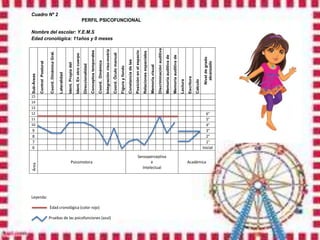 Este documento presenta los resultados de una evaluación psicopedagógica de una niña de 11 años que cursa el 4to grado. La evaluación encontró que la niña tiene bajo rendimiento académico, dificultades en atención y algunas funciones psicológicas. Se recomienda reforzar el área académica, brindar atención individualizada y fortalecer el apoyo familiar para mejorar su desempeño.