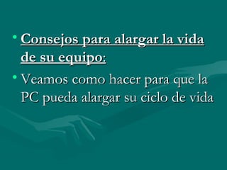 El documento proporciona consejos para extender la vida útil de una computadora personal, como evitar moverla cuando está encendida, mantenerla lejos del agua y la luz solar directa, y actualizar regularmente el antivirus. También recomienda realizar copias de seguridad frecuentes y no ejecutar programas descargados de fuentes desconocidas. Además, presenta varios modelos de impresoras a bajo costo y sus especificaciones técnicas.