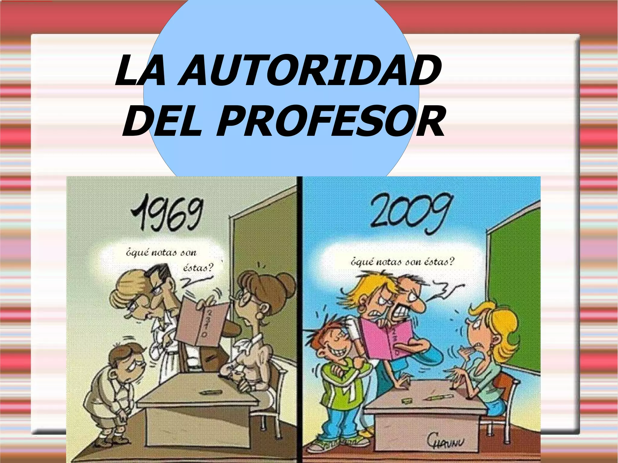 El documento discute los cambios en la educación y la autoridad del profesor. Antes, los profesores tenían más autoridad y respeto, y los estudiantes y padres cumplían con las reglas. Ahora, los profesores han perdido autoridad y son objeto de falta de respeto e incluso acoso. Esto se debe principalmente a la pérdida de complicidad entre padres y profesores. Se proponen soluciones como reforzar la autoridad del profesor, prestar más atención a la diversidad cultural de los estudiantes, y obtener un