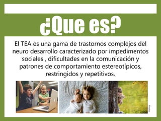 Este documento describe brevemente el trastorno del espectro autista (TEA), las diferencias entre el trastorno de Asperger y el trastorno autista, y el uso potencial de la tecnología de la información y la comunicación (TIC) con niños que tienen TEA. Explica que el TEA implica dificultades sociales, de comunicación y patrones de comportamiento repetitivos, y que el trastorno de Asperger se caracteriza por un buen funcionamiento cognitivo con problemas pragmáticos y sociales, mientras que el trastorno autista