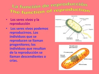 Este documento describe los diferentes tipos de reproducción en los seres vivos, incluyendo la reproducción asexual y sexual. Explica que la reproducción asexual involucra a un solo individuo, mientras que la reproducción sexual requiere de dos individuos. También describe los órganos reproductores en animales y plantas y las etapas de la reproducción sexual, como la producción de gametos, fecundación, desarrollo del cigoto y formación de frutos y semillas.