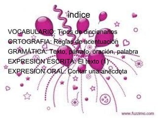 Este documento presenta información sobre diferentes temas relacionados con la lengua española, incluyendo tipos de diccionarios, reglas de acentuación, partes de un texto, y la definición de una anécdota. Explica que los diccionarios pueden ser normativos, enciclopédicos o bilingües, y que las reglas de acentuación determinan cuando se usa tilde dependiendo de la posición y tipo de sílaba tónica. También define las partes de un texto como párrafos, oraciones y palabras, y describe lo que