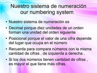 Nuestro sistema de numeración es decimal y posicional, donde el valor de cada cifra depende de su posición. Los números grandes se escriben en grupos de tres cifras separados por espacios. La numeración romana usa letras para representar valores y solo pueden restarse entre sí de ciertas formas. La numeración egipcia es decimal pero no posicional, donde cada símbolo tiene el mismo valor independientemente de su posición.
