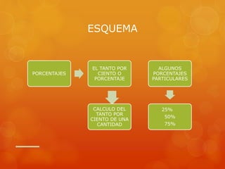 El documento habla sobre los porcentajes. Explica que un porcentaje indica cuántas partes de cien se toman y proporciona ejemplos de porcentajes como 25%, 50% y 75%. También describe cómo calcular el porcentaje de una cantidad dividiendo la cantidad entre cien y multiplicando el resultado por el porcentaje deseado. Incluye enlaces a juegos y videos sobre porcentajes.