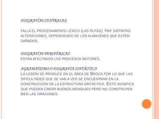 La disgrafía es un trastorno de la escritura que se divide en dos tipos: disgrafías adquiridas, causadas por lesiones cerebrales, y disgrafías evolutivas, que implican dificultades para aprender a escribir. Dentro de estos tipos hay diferentes trastornos según el proceso de escritura dañado, como la planificación del mensaje, la estructura sintáctica, o los procesos motores.