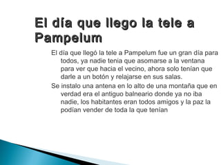 El documento habla sobre la llegada de la televisión al pueblo de Pampelum. Se instaló una antena en lo alto de una montaña y los habitantes estaban contentos de tener este nuevo invento. El alcalde dio un discurso durante la inauguración, diciendo que la televisión sería un gran invento como el teléfono y la radio. La gente aplaudió y aquel día apenas podían apartar los ojos de la televisión.