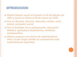 Rudolf Steiner fundó la pedagogía Waldorf en 1919 basada en su filosofía de la antroposofía. La educación Waldorf se centra en el desarrollo holístico del niño a través de un plan de estudios equilibrado que incluye las artes, oficios, idiomas y ciencias. Actualmente existen más de 2,000 escuelas Waldorf en todo el mundo que siguen los principios de Steiner de educar de manera individualizada y a través del juego.