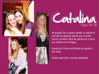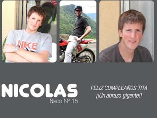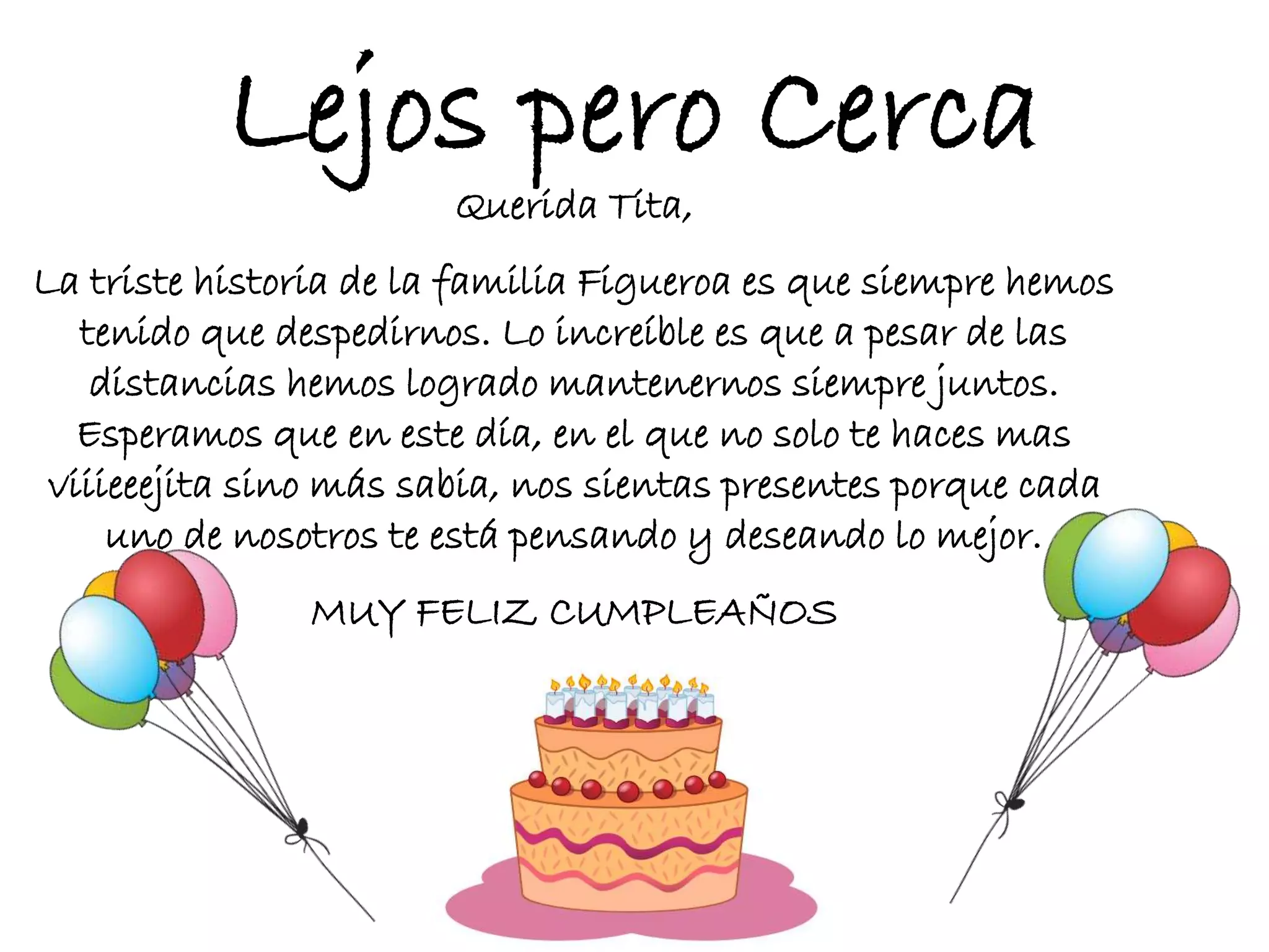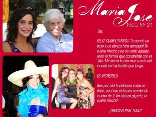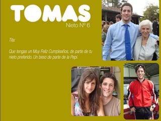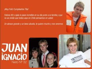 Este documento contiene múltiples mensajes de felicitación de cumpleaños para Tita de parte de varios miembros de su familia, incluyendo a sus hijos, nietos, bisnietos y otros parientes. A pesar de la distancia geográfica, la familia desea expresar su cariño por Tita en su cumpleaños número 80 y desearle lo mejor.