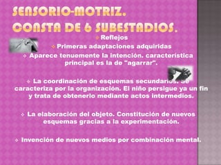 Según Piaget, hay 4 etapas evolutivas del niño: 1) la etapa sensorio-motriz desde el nacimiento hasta los 2 años, 2) la etapa pre-operacional desde los 2 hasta los 7 años, 3) la etapa operacional concreta desde los 7 hasta los 11 años, y 4) la etapa operacional formal desde los 11 años hasta la madurez, caracterizada por razonamiento lógico basado en hipótesis.