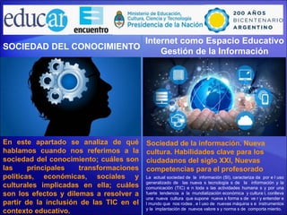 Este documento analiza la sociedad del conocimiento y las transformaciones políticas, económicas, sociales y culturales implicadas. Se refiere a la sociedad del conocimiento como aquella en la que las condiciones del procesamiento de la información y la construcción del conocimiento han sido alteradas por las tecnologías de la información y la comunicación. También discute el papel de Internet, las habilidades necesarias para los ciudadanos del siglo XXI y los nuevos desafíos para la educación en este contexto.