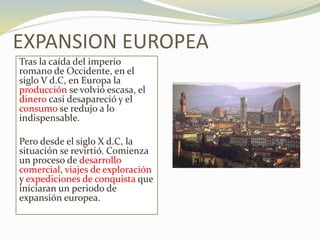 Tras la caída del Imperio Romano, Europa entró en un período de declive económico y social. Sin embargo, a partir del siglo X d.C. se produjo una recuperación gracias al resurgimiento de las ciudades, el comercio, la agricultura y la tecnología, lo que dio paso a la expansión europea a través de la exploración y la conquista.