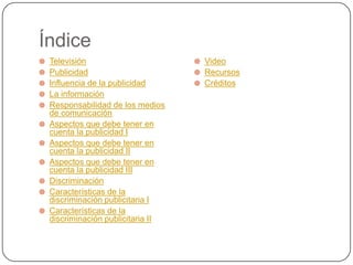 Este documento trata sobre la publicidad y los juguetes dirigidos a niños y niñas. Discute cómo la publicidad en la televisión influye en los roles de género y estereotipos que los niños aprenden, mostrando a las niñas como pasivas y a los niños como creativos. También analiza los aspectos que la publicidad debe considerar para evitar la discriminación, como ofrecer igualdad en la participación de niños y niñas y no reforzar estereotipos rígidos.