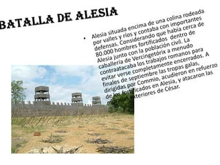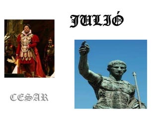 Este documento presenta una biografía de Julio César. Detalla su fecha y lugar de nacimiento, su familia y ascendencia noble. También describe algunas de sus relaciones personales y batallas históricas clave como la Batalla de Bibracte, la Batalla de Alesia, la Batalla de Farsalia y la Batalla de Tapso. Además, discute su carrera como historiador, escritor y figura literaria y cinematográfica.