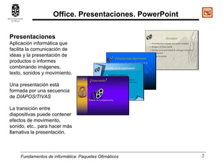 PowerPoint es una aplicación que permite crear presentaciones combinando texto, imágenes, sonidos y videos para comunicar ideas de manera efectiva. Las presentaciones están compuestas de diapositivas entre las cuales se pueden añadir transiciones y efectos. PowerPoint ofrece diferentes vistas y herramientas para diseñar, modificar y gestionar diapositivas, así como insertar tablas, gráficos, imágenes y otros elementos multimedia para enriquecer las presentaciones.