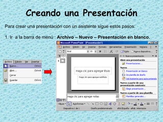 Este documento proporciona instrucciones para crear una presentación en PowerPoint y agregar diapositivas, texto y efectos de animación. Explica cómo crear una nueva presentación, insertar diapositivas vacías mediante el menú o botones, y agregar cuadros de texto. También describe cómo seleccionar objetos y texto, personalizar sus animaciones en el panel de tareas, y aplicar efectos, velocidad e inicio de animación.
