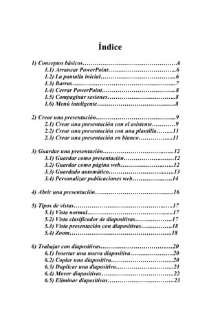 Este manual de PowerPoint explica los conceptos básicos del programa como arrancarlo, la pantalla inicial, las barras y cómo cerrarlo. También describe cómo crear presentaciones mediante el asistente, plantillas o de forma en blanco, y guardarlas como presentación o página web. Explica los tipos de vistas y cómo trabajar con diapositivas, objetos, textos, tablas, gráficos y diagramas. Por último, habla de la barra de dibujo, inserción de sonidos, películas, animaciones y transiciones.