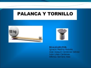 El documento aborda la definición y características de las palancas y tornillos, así como sus partes fundamentales y los tipos de palancas: de primer, segundo y tercer grado. Se detalla la mecánica detrás de las palancas, incluyendo la relación entre potencia, resistencia y brazos. Se menciona el impacto histórico del uso de la palanca en la vida cotidiana desde la prehistoria.
