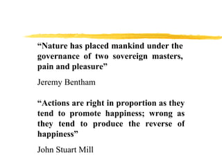 El documento describe las ideas fundamentales del utilitarismo. Este sostiene que las acciones se deben evaluar en función de si aumentan o disminuyen la felicidad del mayor número de personas. Los orígenes del utilitarismo se remontan a filósofos como Hutcheson y Hume, pero fue desarrollado principalmente por Jeremy Bentham y John Stuart Mill. El utilitarismo se basa en el hedonismo ético y busca maximizar el placer y la felicidad colectiva.