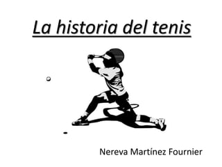 El documento resume la historia del tenis desde sus orígenes en Inglaterra y Francia en el siglo XII, cuando se jugaba con las manos, hasta su evolución en el siglo XVI al utilizarse raquetas de madera. Luego describe cómo se crearon las primeras reglas y torneos a finales del siglo XIX, incluyendo la creación de la ATP y el ranking masculino en los años 1970. También menciona la fundación del Salón de la Fama del Tenis en 1954.