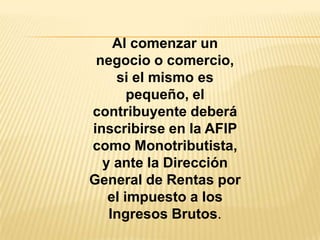 El documento habla sobre el régimen de Monotributo en Argentina, el cual permite que pequeños contribuyentes y comerciantes se inscriban en la AFIP para simplificar el pago de impuestos como Ganancias, Valor Agregado, jubilación y obra social.