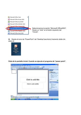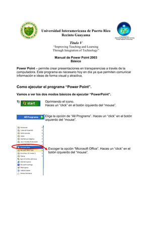 Este documento proporciona una introducción al programa PowerPoint y explica cómo ejecutarlo y utilizar sus funciones básicas. Describe los elementos clave de la interfaz como las barras de menú, herramientas y vista, y explica cómo crear y formatear diapositivas, insertar objetos multimedia, y realizar presentaciones.