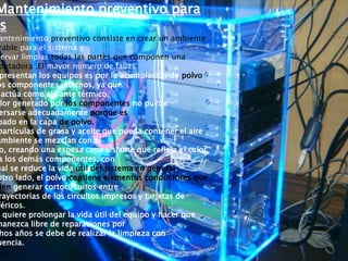 El nuevo Aspire One D260 de Acer tiene un diseño ultrafino y liviano, hasta 8 horas de autonomía de batería y un aspecto elegante. El mantenimiento preventivo consiste en crear un ambiente favorable para el sistema y mantener limpias todas las partes que componen una computadora para prolongar su vida útil. Las principales partes de una computadora incluyen la tarjeta madre, la CPU, la memoria RAM, el disco duro, la unidad de CD/DVD, el monitor, el teclado y el mouse.