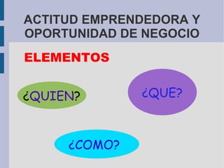 El documento habla sobre la creación y gestión de microempresas, incluyendo los elementos clave de emprendimiento como el emprendedor, sus motivaciones y aptitudes, la oportunidad de negocio identificada a través de la imaginación y creatividad para satisfacer necesidades del mercado, y cómo llevar a cabo el plan de viabilidad y los trámites de constitución de la empresa o sociedad con el asesoramiento y ayuda disponible.