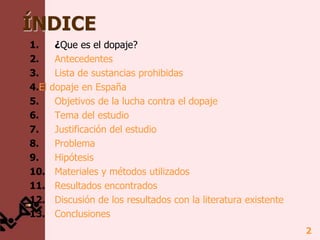Este documento trata sobre el dopaje en el deporte de elite. Explica qué es el dopaje y ofrece diferentes definiciones. Luego discute los antecedentes históricos del dopaje, la lista actual de sustancias prohibidas y el problema del dopaje en España. Finalmente, identifica los objetivos de la lucha contra el dopaje y justifica un estudio sobre la prevención del dopaje desde la educación física en el deporte de alto rendimiento.