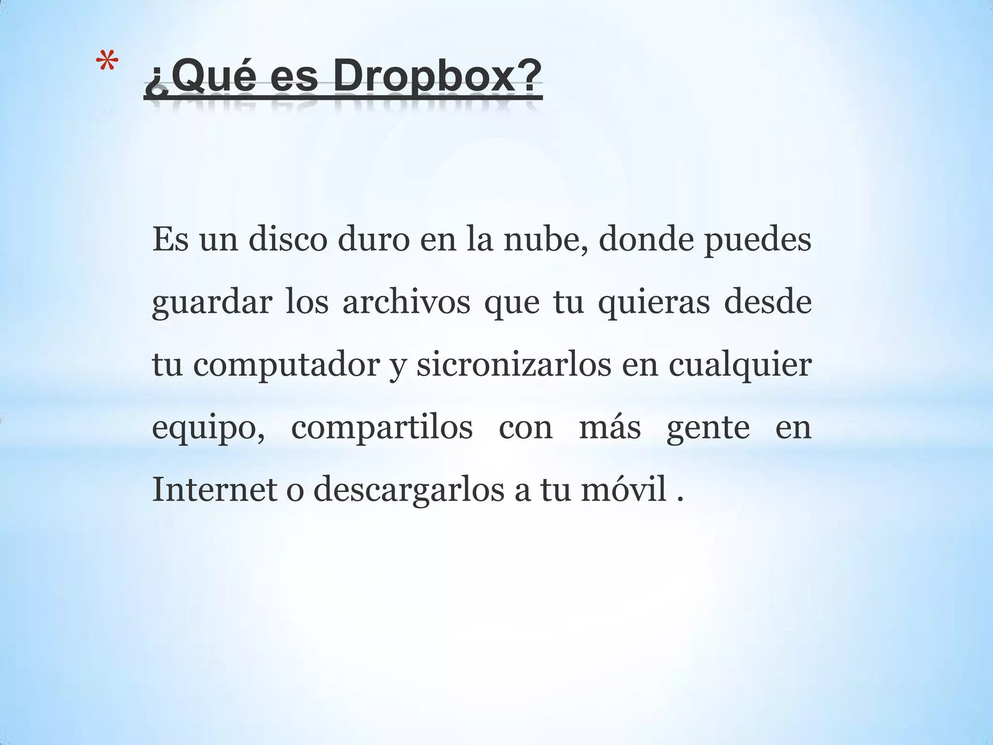 Dropbox es un servicio en la nube que permite a los usuarios almacenar y sincronizar archivos entre dispositivos. Los usuarios designan una carpeta en su computadora donde Dropbox almacena y sincroniza los archivos. Estos archivos también pueden ser compartidos con otros usuarios de Dropbox o accedidos desde cualquier dispositivo a través de la página web de Dropbox.