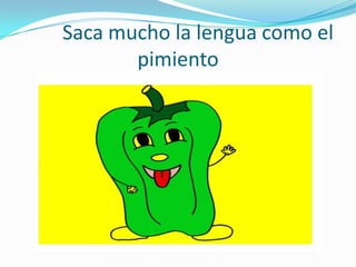 El documento instruye a realizar una serie de movimientos con la boca imitando frutas y verduras, como sacar mucho la lengua como un pimiento, tocar la nariz con la lengua como una berenjena, sonreír como una manzana, y despedirse con un beso como unas peras.
