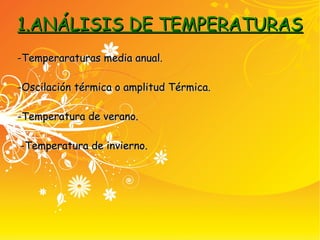Este documento proporciona instrucciones para analizar y comentar un diagrama ombrotérmico de España. Explica cómo analizar las temperaturas anuales, de verano e invierno, así como la oscilación térmica. También describe el análisis de las precipitaciones totales anuales, su distribución y forma. Además, detalla el análisis de la aridez mensual y general. Finalmente, indica cómo clasificar el clima, localizarlo geográficamente y relacionarlo con otros elementos del medio ambiente y activ