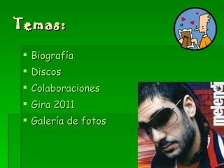 Ramón Melendi es un cantante español de rumba, rock, flamenco y pop originario de Asturias. Ha publicado varios discos exitosos desde 2003, incluyendo Sin noticias de Holanda, Que el cielo espere sentao y Mientras no cueste trabajo. También ha colaborado con varios otros artistas y tiene varios conciertos programados como parte de su gira de 2011.