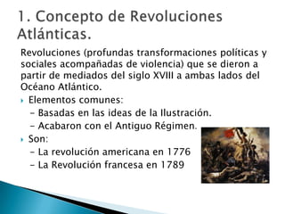 El documento describe las revoluciones americana y francesa de finales del siglo XVIII. Ambas revoluciones estuvieron impulsadas por las ideas de la Ilustración y pusieron fin al Antiguo Régimen. La revolución americana en 1776 condujo a la independencia de las 13 colonias británicas en Norteamérica, mientras que la Revolución francesa de 1789 derrocó a la monarquía absoluta francesa y estableció una república.