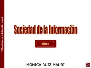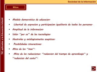 Este documento discute varios mitos comunes sobre las tecnologías de la información y la comunicación (TIC) y su aplicación en la educación infantil. Algunos de los mitos mencionados son que las TIC permitirán una educación más democrática para todos, que son neutrales y asépticas, y que resolverán todos los problemas educativos. El documento argumenta que estas creencias no siempre son precisas y que el valor de las TIC depende de cómo se utilizan en el contexto educativo.