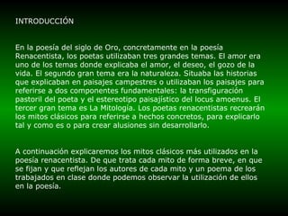 Este documento presenta una introducción a los mitos clásicos más utilizados en la poesía renacentista del Siglo de Oro español. Explica brevemente cada mito, incluyendo Apolo y Dafne, Orfeo y Eurídice, Ícaro y Dédalo, Faetón, Sísifo, Narciso, Prometeo, Tántalo, Ixión, Ariadna y Teseo y Ulises. Además, incluye ejemplos de poemas que ilustran el uso de estos mitos, con autores como Garcil
