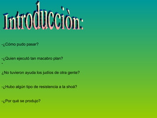 El documento resume la Shoá o Holocausto, incluyendo las víctimas (5.6-6.1 millones de judíos asesinados), la estructura de la persecución (primero la idea de diferenciar a los judíos, luego separarlos físicamente en guetos, y finalmente deportarlos y asesinarlos), las formas de resistencia judía (incluyendo el ejército judío y las sublevaciones en los guetos), y las actividades religiosas que ayudaron a mantener la identidad cultural judía a pesar de la persecuc
