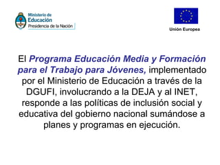 El programa tiene como objetivo mejorar las capacidades de acceso al mundo del trabajo de jóvenes vulnerables en Argentina mediante la promoción de la educación secundaria y formación laboral. Es financiado en un 60% por el gobierno nacional y jurisdicciones, y un 40% por una donación de la Unión Europea de €21.4 millones. Implementa acciones a nivel institucional y de sedes educativas en 23 provincias para fortalecer la articulación entre educación permanente de jóvenes y adultos y formación profesional.