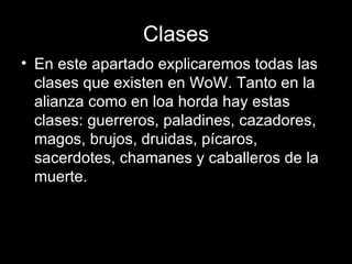 El documento describe las diferentes clases y razas jugables en el juego World of Warcraft. Explica las 10 clases disponibles para ambas facciones (Alianza y Horda): guerreros, paladines, cazadores, magos, brujos, druidas, pícaros, sacerdotes, chamanes y caballeros de la muerte. También describe brevemente las habilidades de cada clase y las 5 razas que componen cada facción (Alianza: humanos, enanos, gnomos, elfos de la noche y draeneis; Hord