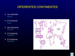 DIFERENTES CONTINENTES 1ercontinente: * África 2º Continente: * Asia 3er Continente: * Europa 4º Continente: * América 5º Continente: * Oceanía