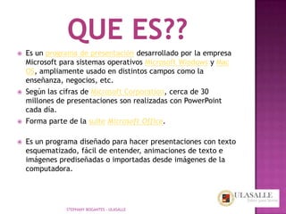 PowerPoint es un programa de presentaciones desarrollado por Microsoft que se usa ampliamente en la enseñanza, los negocios y otros campos. Forma parte de Microsoft Office y permite crear presentaciones con texto, imágenes y animaciones para ser entendidas fácilmente. PowerPoint es uno de los programas de presentación más populares.