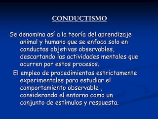 El documento presenta una descripción general de la teoría conductista en psicología. En pocas oraciones, el conductismo se enfoca en el estudio objetivo del comportamiento observable mediante métodos experimentales, descartando los procesos mentales. Las principales figuras son Watson, Skinner y Tolman, quienes desarrollaron variantes como el conductismo clásico, operante e intencionista.