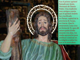 Andrés fue el primer apóstol llamado por Jesús y hermano de Simón Pedro. Una tradición cuenta que fue crucificado en forma de X en Patras, Grecia, donde predicó durante tres días desde la cruz. La festividad de San Andrés se celebra en una ermita a 15 km de Viso del Marqués, España, con romería el jueves y actividades como misa, procesiones, música y suelta de vaquillas el fin de semana.