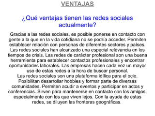 Este documento describe algunas ventajas y desventajas de las redes sociales. Entre las ventajas se encuentran la capacidad de conectarse con personas de diferentes lugares, establecer contactos profesionales y encontrar oportunidades laborales. Sin embargo, también plantea riesgos como publicar contenido inapropiado, agregar desconocidos y compartir demasiada información personal. Además, sugiere que ciertas personas pueden desarrollar adicción a las redes sociales y que no son entornos completamente seguros debido a la falta de