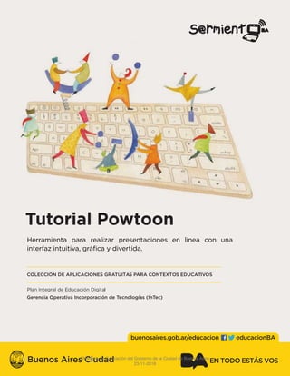 Este documento presenta un tutorial sobre la herramienta Powtoon, que permite crear presentaciones animadas de manera intuitiva. Explica los requisitos técnicos, consideraciones pedagógicas y muestra paso a paso cómo registrarse, crear una presentación, agregar texto, imágenes, videos y audio, e incorporar personajes. Además, indica cómo guardar, previsualizar y publicar las presentaciones creadas.
