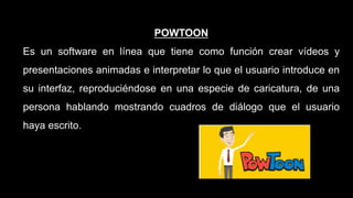 Powtoon es un software en línea que permite a los usuarios crear presentaciones y videos animados insertando objetos, texto, imágenes y sonido. Los usuarios pueden crear una cuenta gratuita, diseñar una presentación eligiendo transiciones entre diapositivas, y exportar o compartir su creación insertando el código en un blog o subiéndola a YouTube.