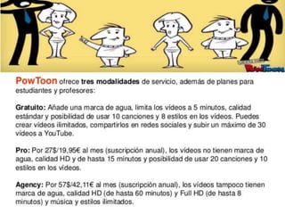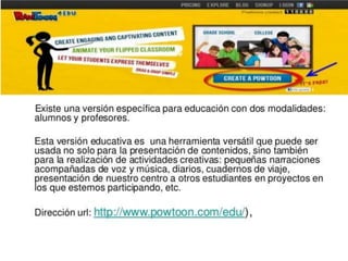 Powtoon es una plataforma en línea gratuita para crear presentaciones y videos animados de manera fácil e intuitiva. Ofrece plantillas prediseñadas y herramientas para agregar texto, imágenes, sonido y efectos a las diapositivas. Aunque su interfaz está en inglés, guía al usuario paso a paso en el proceso de edición, publicación y compartir del contenido generado.