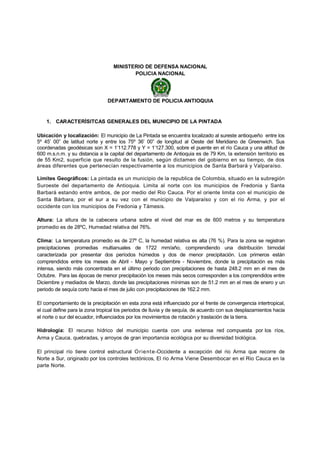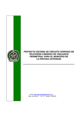 Este documento describe un proyecto para instalar cámaras de vigilancia perimetral en el municipio de La Pintada, Antioquia. Detalla la ubicación, límites, clima e hidrología del municipio. También analiza las amenazas en el territorio como inundaciones, deslizamientos e incendios. Finalmente, divide la cabecera municipal en 10 zonas de riesgo de acuerdo con las amenazas identificadas.