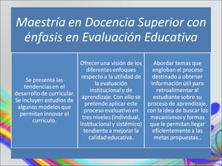 La maestría en evaluación educativa de la Universidad Tecnológica OTEIMA busca formar profesionales en el campo de la evaluación educativa. El programa es semi-presencial o virtual y se enfoca en desarrollar habilidades para planificar, dirigir y asesorar sistemas de evaluación educativa. Los requisitos incluyen tener un posgrado en docencia superior y mantener un promedio mínimo de 81% en el programa.